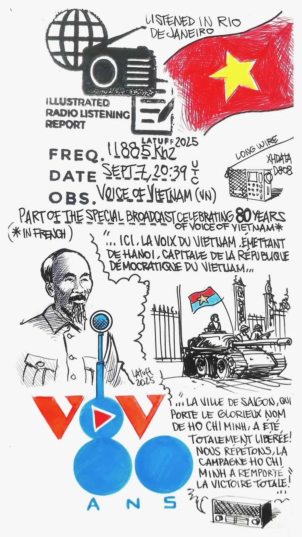 Many thanks to SRAA contributor Carlos Latuff, who shares the following recording and illustrated listening report for this Voice of Vietnam broadcast celebrating their 80th anniversary. This recording was made on September 7, 2025 at 20:39 UTC on 11,885 kHz from Rio de Janeiro, Brazil: